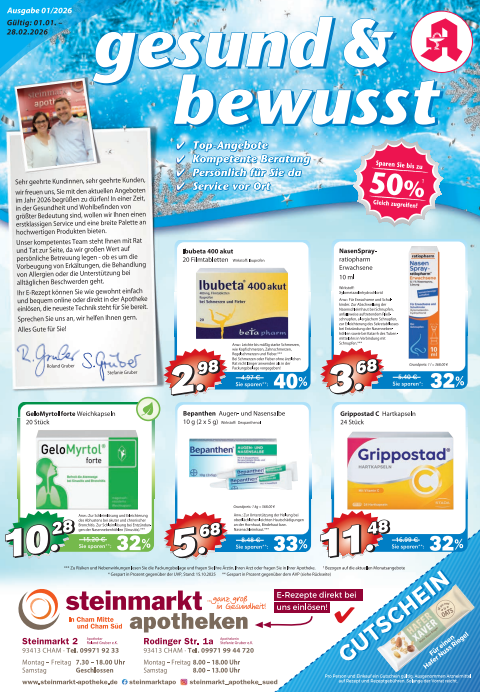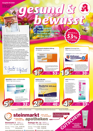 Brauchen Sie eine professionelle gesundheitliche Beratung oder erstklassige Kosmetikprodukte? In der Steinmarkt Apotheke sind wir für Ihr Wohlbefinden und Ihre Gesundheit da. Unser fachkundiges Team bietet Ihnen ausführliche Beratung und eine reiche Palette an Medikamenten und Gesundheitsprodukten. Vertrauen Sie auf unseren individuellen, auf Sie zugeschnittenen Service.